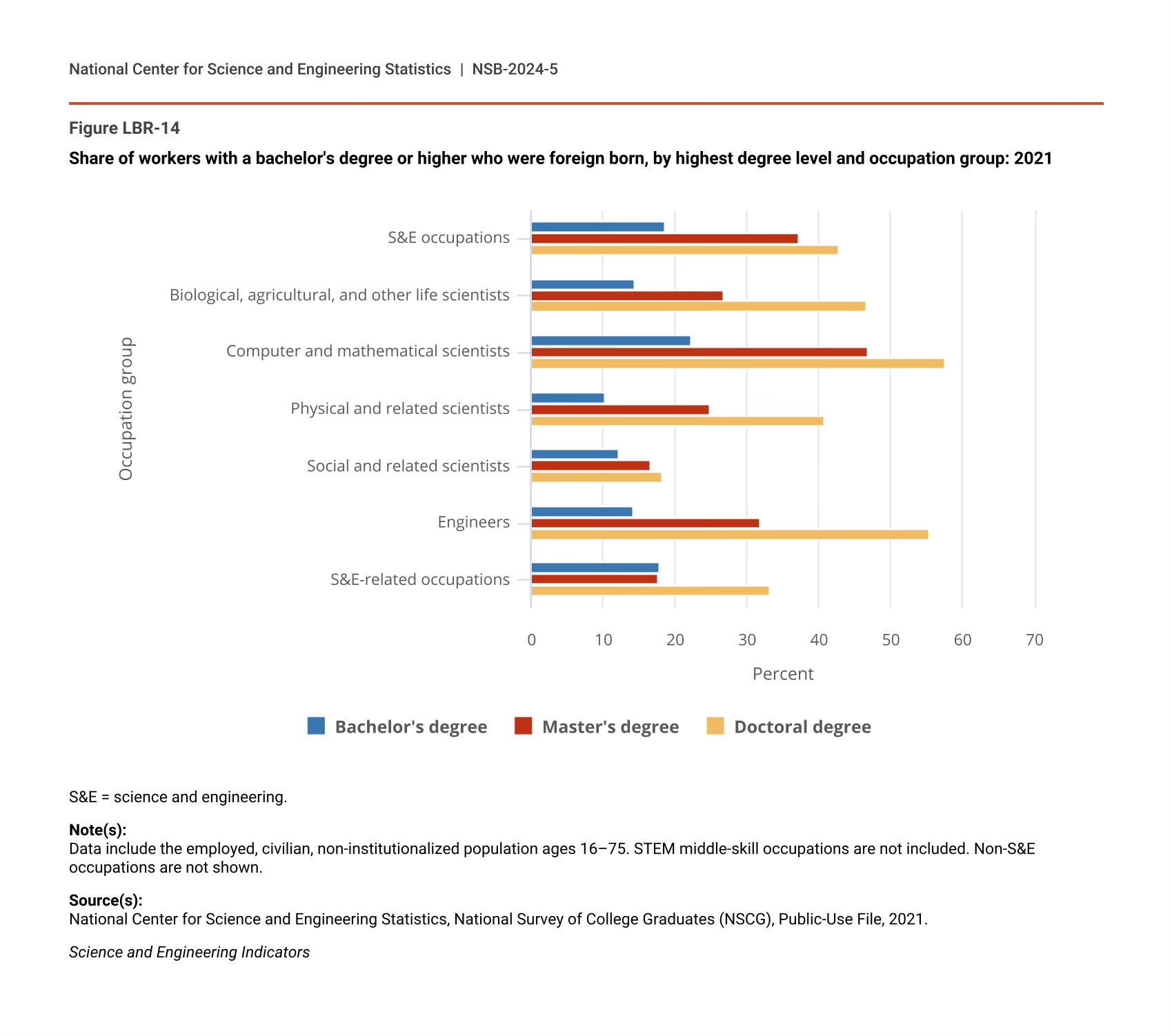 In the piece, I discussed some statistics from the National Science Foundation’s 2014 Science and Engineering Indicators. The current 2024 edition reports that 19% of STEM workers (over 7 million people) are foreign-born. If you ask, what fraction of all foreign-born workers are employed in STEM occupations, the answer is 26% — more than a quarter of all foreign-born workers in the U.S. work in a STEM job.