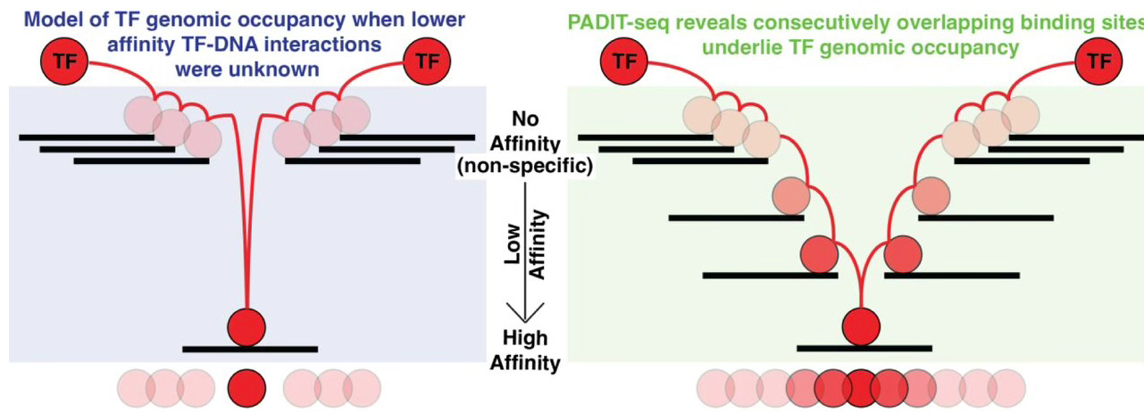 The punch line of the PADIT-seq paper is more evidence for an idea that has been floating around in the field for a little while: effective DNA binding sites are often surrounded by a halo of weaker affinity binding sites. These weaker sites may act to create an elevated binding affinity landscape around the main binding site, thus distinguishing functional binding sites from non-functional sites.