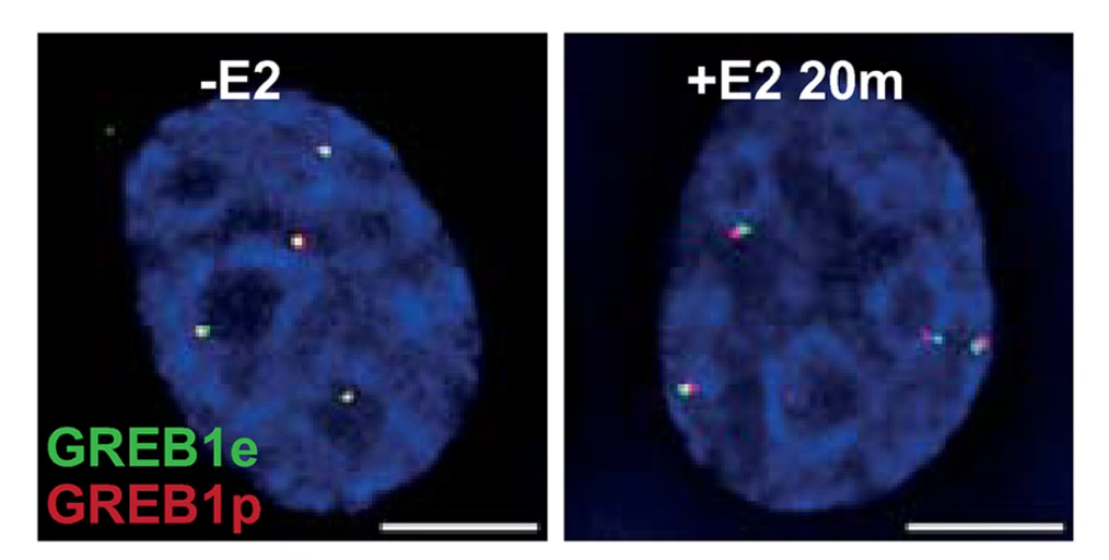 Wendy Bickmore’s lab, at the MRC Human Genetics Unit at the University of Edinburgh, examined several inducible enhancers to tackle the question of how close enhancers need to be their target. The Bickmore lab used inducible enhancers because that allowed them to see how the enhancer-target distance changes between the uninduced, off state and the induced, on state. The idea behind the experiments is simple: Use both microscopy and cross-linking/sequencing to measure the change between the off and on states. Then make some careful perturbations to the enhancer to tease out key differences between the measurements.