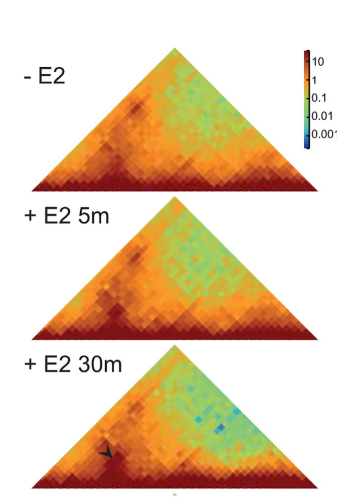 In other words, bringing the enhancer close to its target is a separable event from active transcription of the gene - you can have one without the other. During active transcription, enhancer and target don’t necessarily need to be particularly close, perhaps because there is a large molecular apparatus bridging the gap between them.